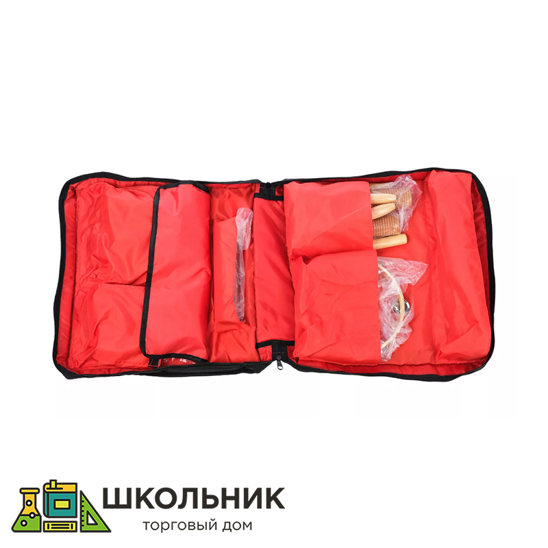 Набор перкуссии 17 предметов в чехле (маракасы на ручке деревянные, кастаньеты на ручке, треугольники 5 штук, тамбурин, кастаньеты, шейкер металлический, бубен, гуиро, агого, тон-блок, двойной тон-блок).